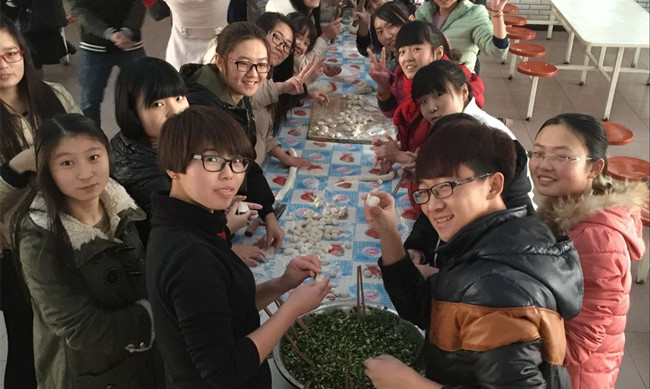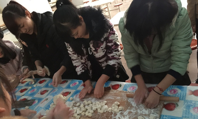 在冬至日下午2:30,14级化学专业全体55名同学聚集在餐厅,餐厅工作人员先给同学们做示范。接下来同学们各显其能,擀皮的擀皮,包饺子的包饺子,奇形怪状的饺子不时出现,虽然引得大家爆笑不已,但那是每个人自己的创意,体现的是各个地方的不同风俗和饺子样式。大家围绕学习、生活和工作等话题不时的交谈着,憧憬着自己也能成为“娇子”。