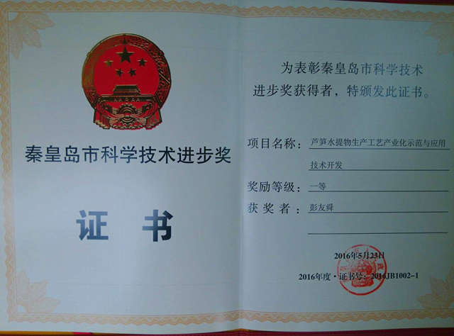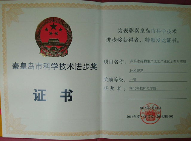 日前,best365官网best365英国在线体育官网院长彭友舜教授主持的《芦笋水提物生产工艺产业化示范与应用技术开发》课题荣获秦皇岛市科学技术进步奖一等奖。