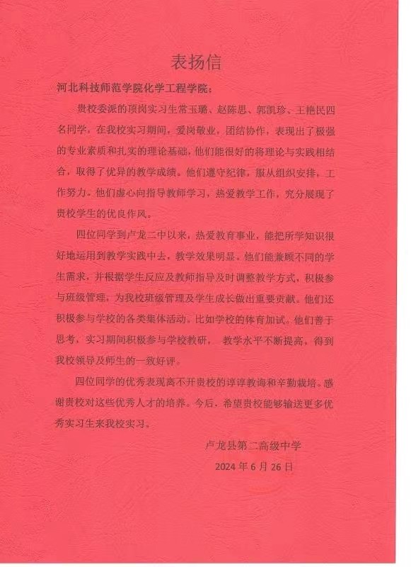 此次教育实习,历时16周,best365官网学生得到了实习学校的充分认可与肯定,南戴河中学、卢龙县第二高级中学分别给best365官网发来锦旗和感谢信。