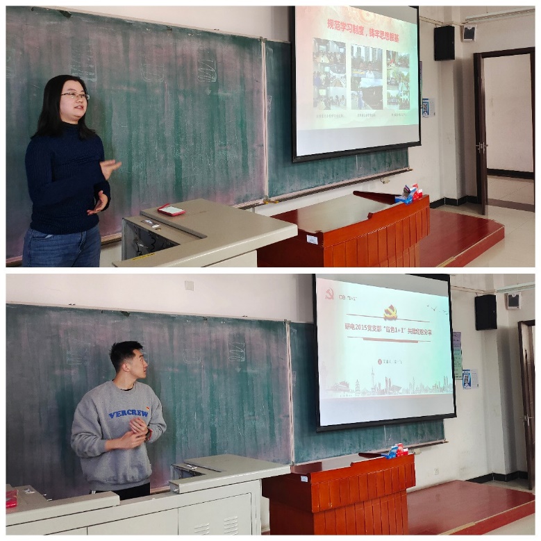 学院本科2019级党支部书记王欣和研电2015党支部书记孟一飞分别介绍了特色活动示范党支部创建、红色“1+1”示范活动的先进经验。王欣从支部基本情况、支部建设情况、工作建议三方面进行分享,提出党支部应结合上级要求、结合时事学习、结合个人发展创造性开展工作,做到提前制定计划、规范支部运行、有效开展活动。孟一飞从深化党史学习、继承先烈遗志、发挥特色优势、开展精准支教等四方面介绍支部共建情况,建议注重提升党员参与感和积极性,开展重实践、练能力、有意义的高质量共建活动。