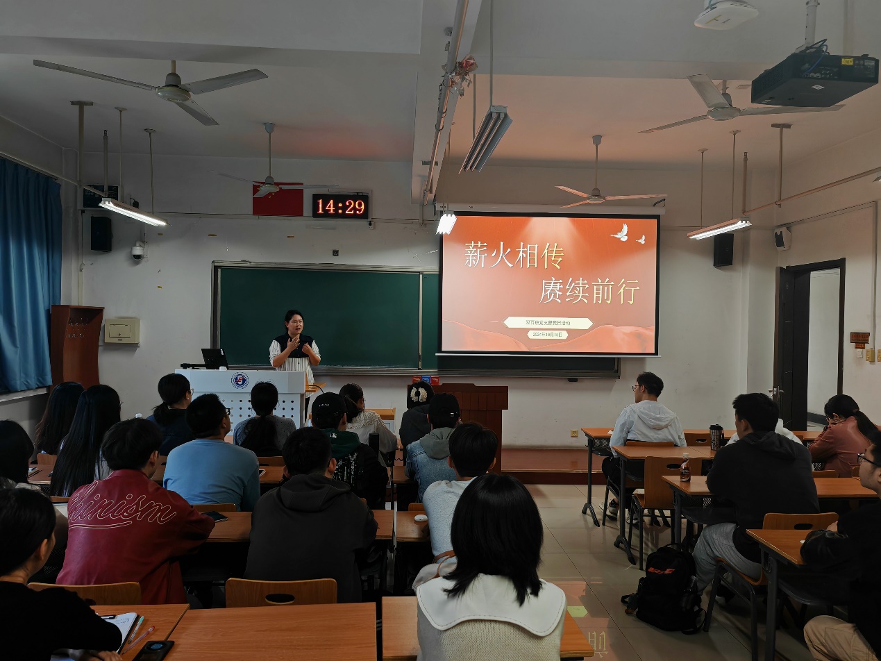 10月15日,双百班党支部于主B423开展“薪火相传 赓续前行”主题党日活动,活动由党支部书记丁宁主持,党支部党员、发展对象、积极分子等四十余名同学参会。