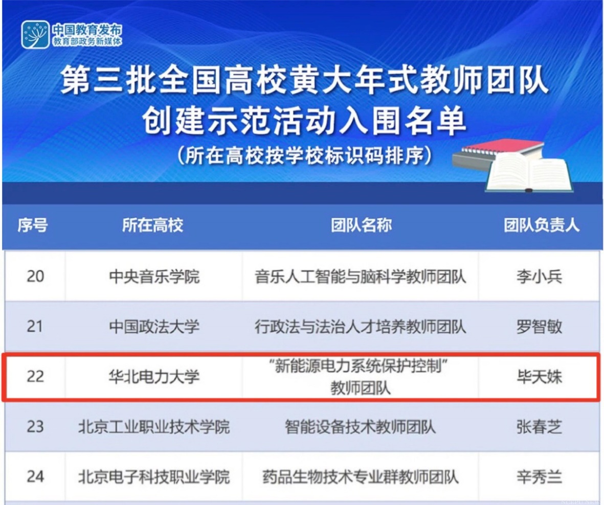 近日,教育部发布关于第三批“全国高校黄大年式教师团队”创建示范活动入围名单,永利官网毕天姝教授带领的新能源电力系统保护控制团队成功入选。这是永利官网继能源动力与机械工程学院“热科学与工程”团队之后再次获批“全国高校黄大年式教师团队”,是学校学习贯彻党的二十大精神,推进高素质专业化创新型高校教师队伍建设的又一个重要标志性成果。