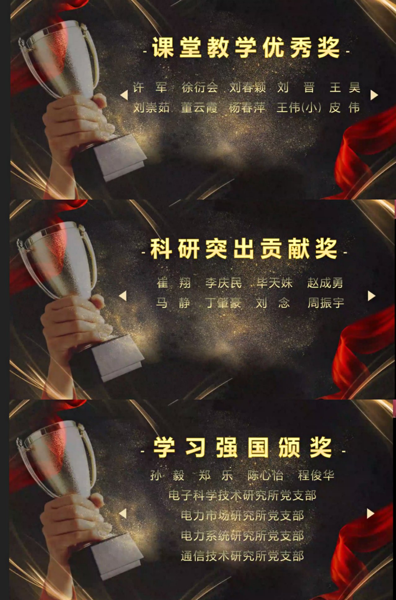 为表彰先进、树立典范,进一步发挥榜样力量,学院授予许军、徐衍会、刘春颖、刘晋、王昊、刘崇茹、董云霞、杨春萍、王伟、皮伟等10位教师课堂教学优秀奖,授予崔翔、李庆民、毕天姝、赵成勇、马静、丁肇豪、刘念、周振宇等8位教师科研突出贡献奖。同时对使用学习强国优秀个人和组织予以表彰,授予电子科学技术研究所党支部等4个党支部优秀组织奖, 授予孙毅、郑乐、陈心怡、程俊华等4名同志学习成绩综合优秀奖。