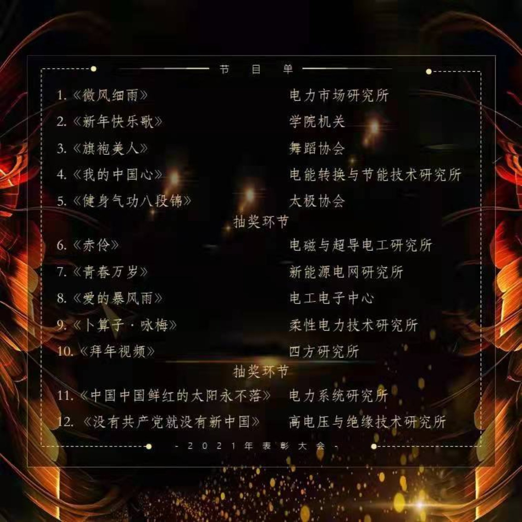 表彰大会结束后,2022年新春团拜会在欢乐的氛围中拉开帷幕。学院全体教职员工踊跃参与,整场团拜会高潮迭起,内容丰富,形式多样。各个研究所和文体协会献上合唱、舞蹈、太极、朗诵等文艺节目。歌声激昂滂湃、舞姿婉约优美、太极张弛有度、朗诵深情款款,共同打造了一场视听盛宴,展现了电气学院教职员工团结一心、积极向上、和谐友爱的精神风貌。精彩纷呈的节目将团拜会推向一个又一个高潮,直播弹幕中鼓掌、鲜花、喝彩络绎不绝、热闹非凡。